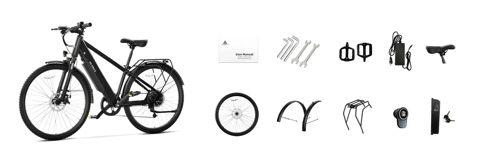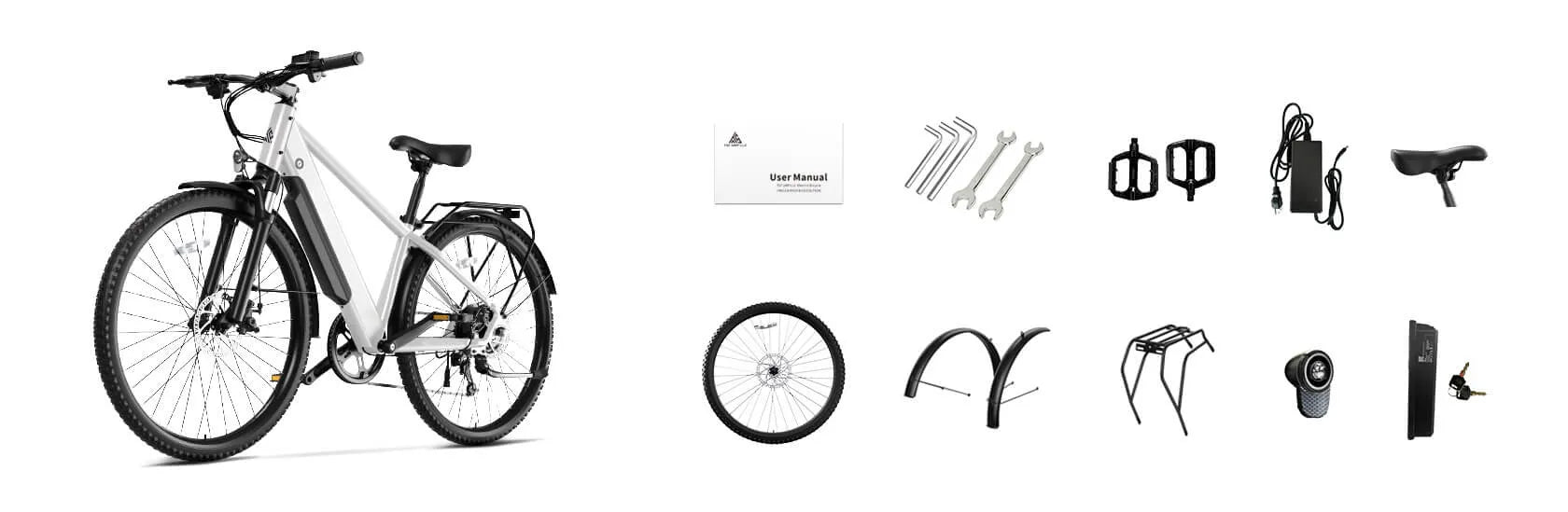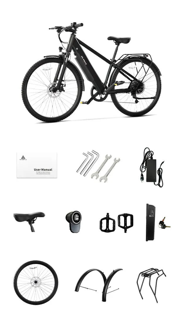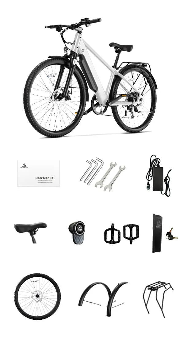 The TST C624 26'' City Ebike comes with free accessories including a full set of fenders and a rear rack, adding convenience and value. These essential add-ons help protect you from road spray and provide extra cargo capacity, making the bike ready for everyday urban commuting right out of the box.