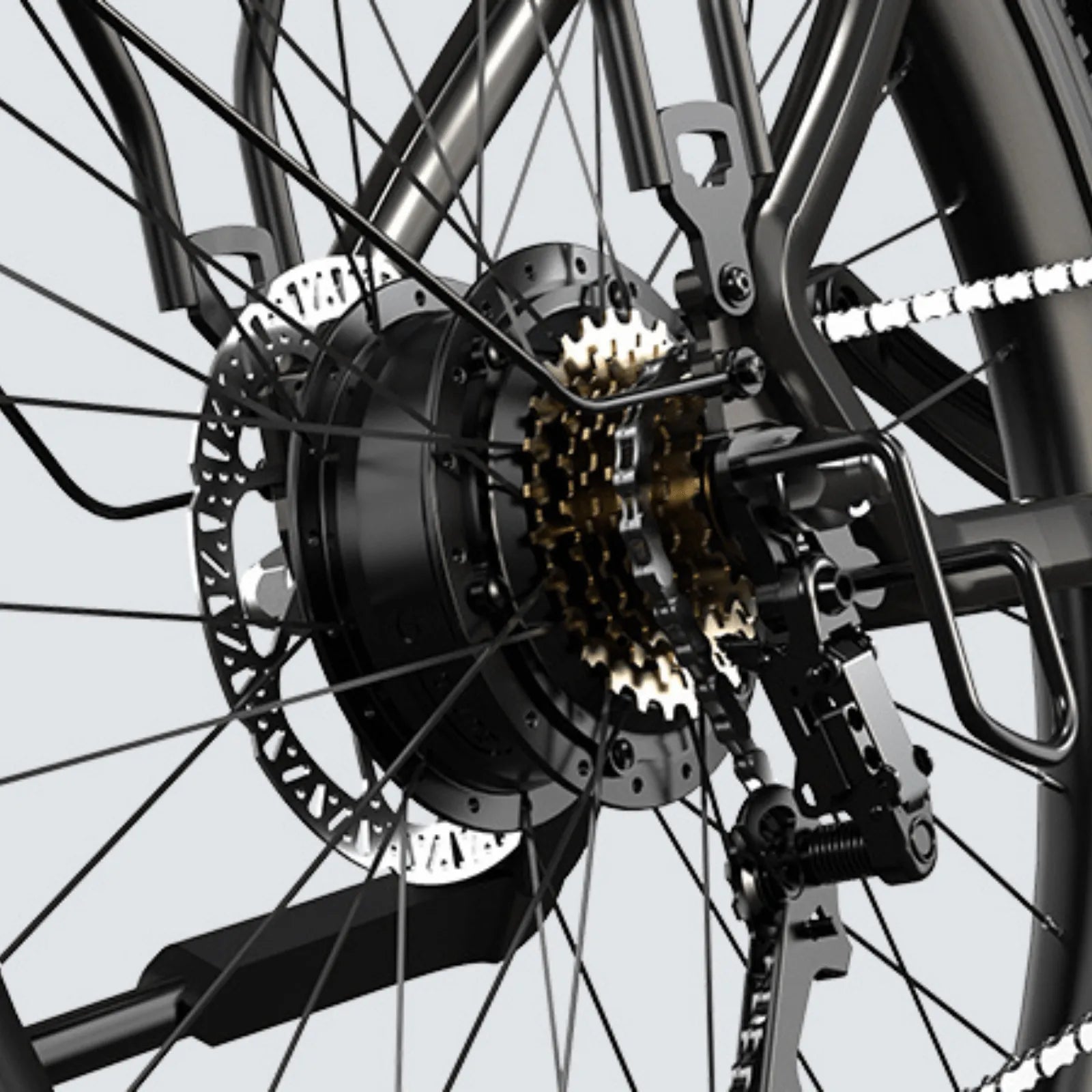 A 1000W brushless motor delivers powerful acceleration, strong hill-climbing ability, and smooth, quiet operation. It increases payload capacity and efficiency, enabling riders to tackle steep inclines and carry heavier loads with ease. This motor type requires less maintenance and offers longer lifespan, making it ideal for urban and commuter ebikes like the TST® Flyer 27.5".