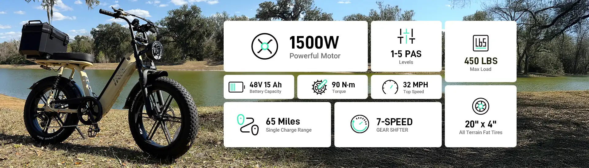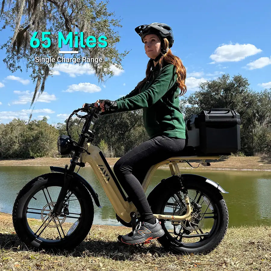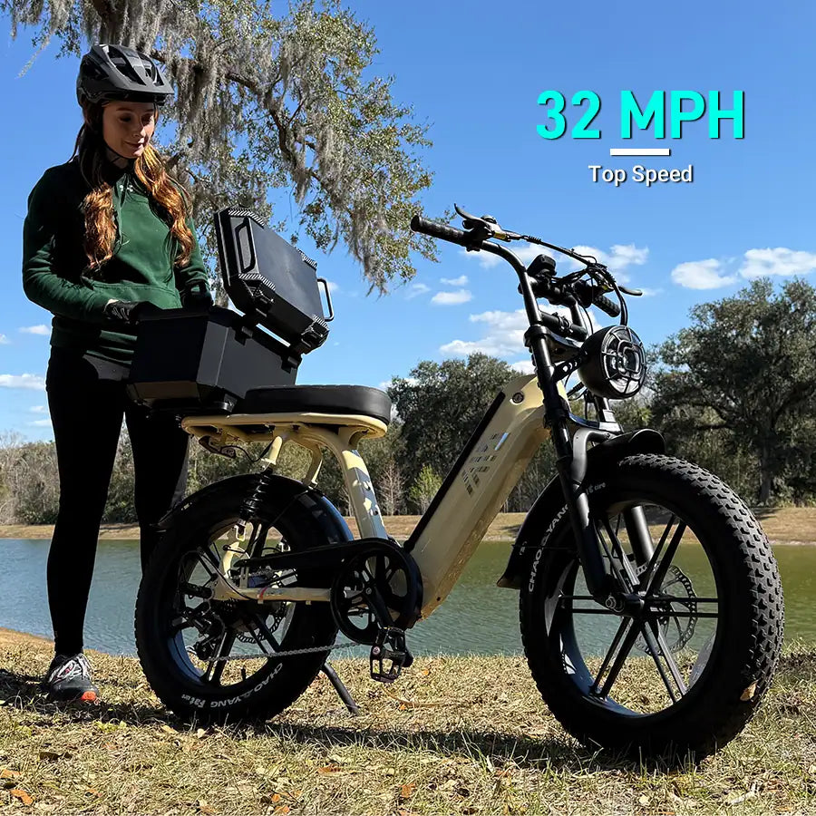 Powered by a 1500W motor and a removable 48V 15Ah battery, it reaches up to 32 mph with a 65-mile range.