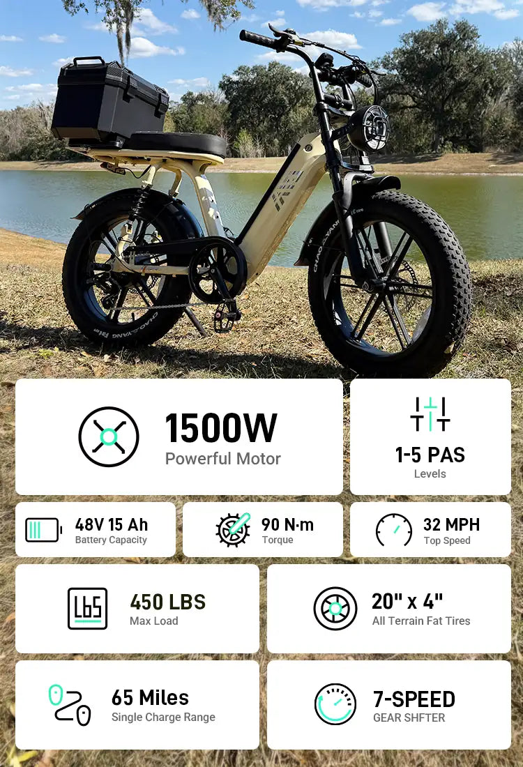 Powered by a 1500W high-torque rear hub motor, it delivers smooth acceleration up to 32 mph. The 48V 15Ah removable lithium battery provides up to 65 miles of range and fully charges in about 5 hours, perfect for everyday use.