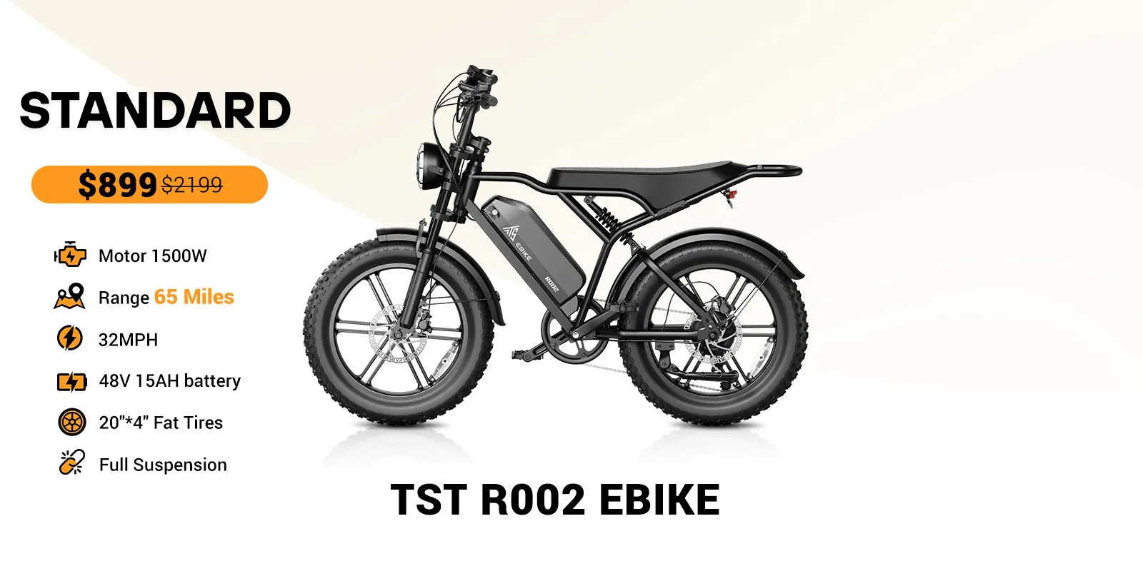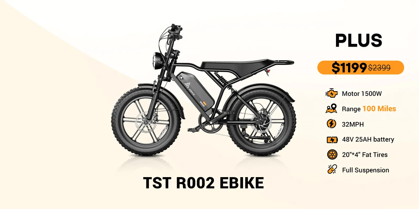 The TST R002 is a powerful, full-suspension moped-style electric bike designed for smooth and versatile riding. It features a 1500W rear hub motor and a 48V 15Ah or 25Ah removable battery, delivering speeds up to 32 mph and a range of 65–100 miles per charge. Built for comfort, it includes hydraulic disc brakes, a Shimano 7-speed gear system, and front and rear suspension. Four riding modes and an LCD display enhance your control and visibility. Perfect for commuting or weekend rides, the R002 blends style, power, and utility—now with a BIG discount and a free front light and fender set for a limited time.