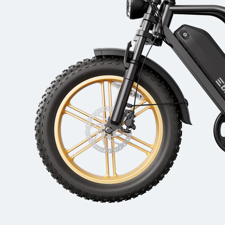 R9 electric bike 20" x 4" tires provide stability and traction on all terrains and improve night riding visibility.