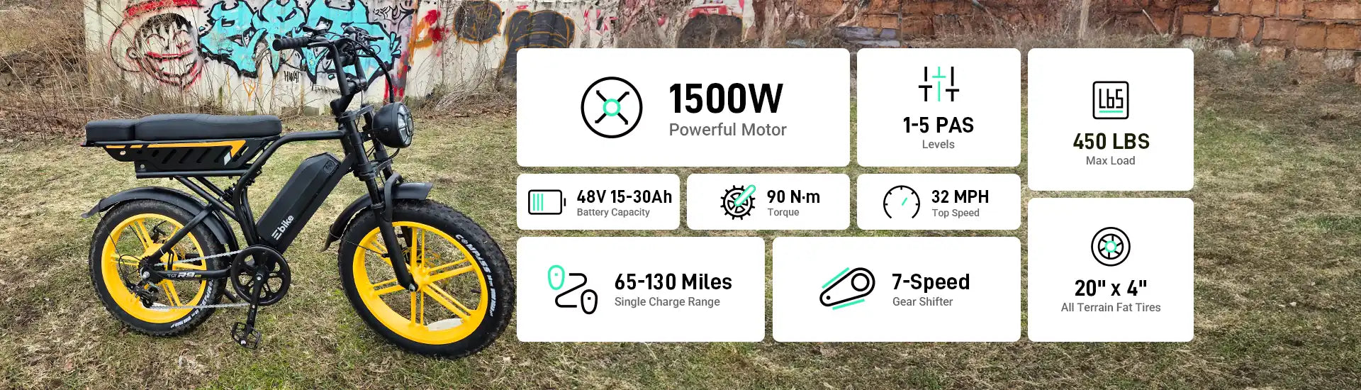A: The 1500W peak rear hub motor delivers strong acceleration and solid climbing performance. Compared to lower-power eBikes, it feels faster, smoother, and more capable on hills, snow, sand, and rough terrain.